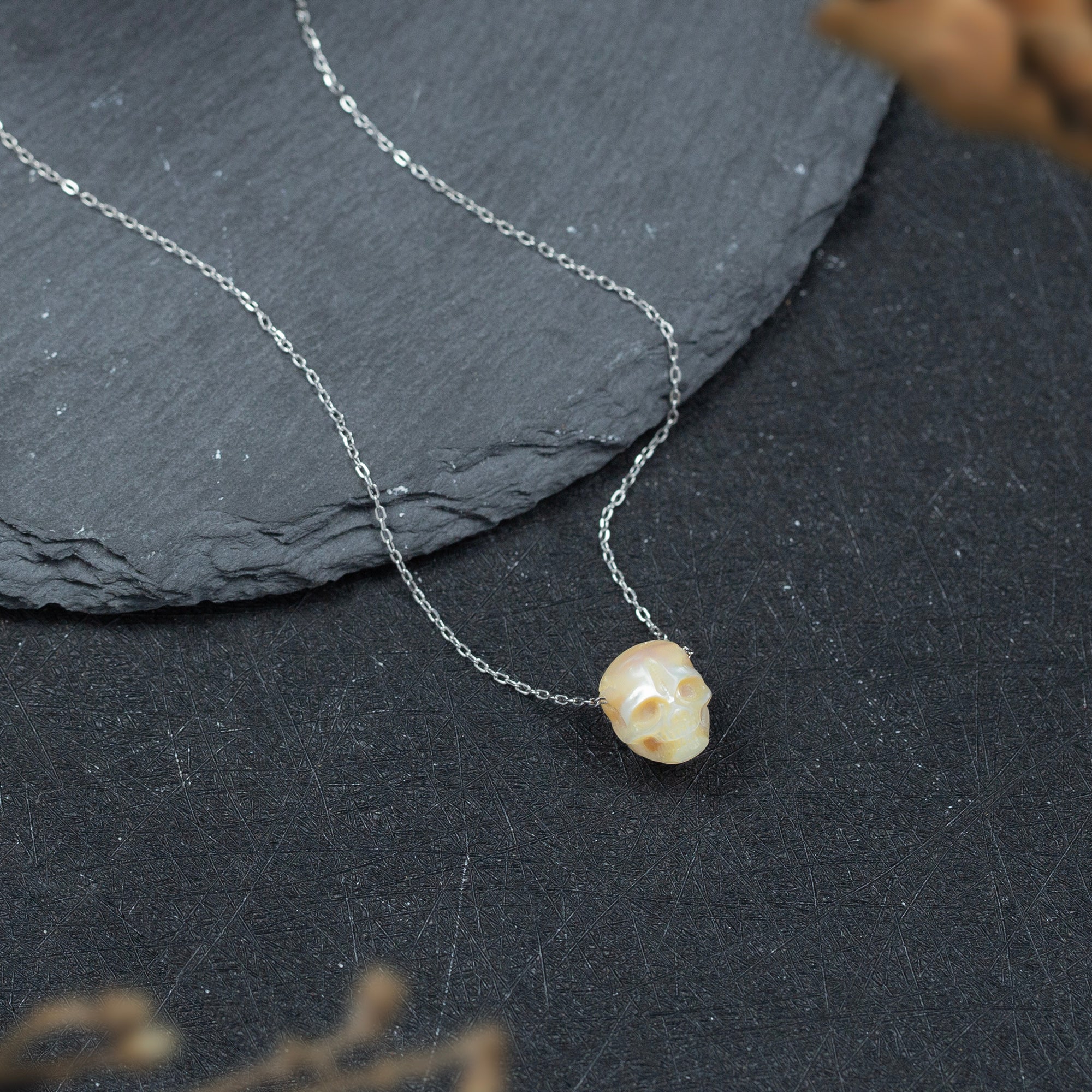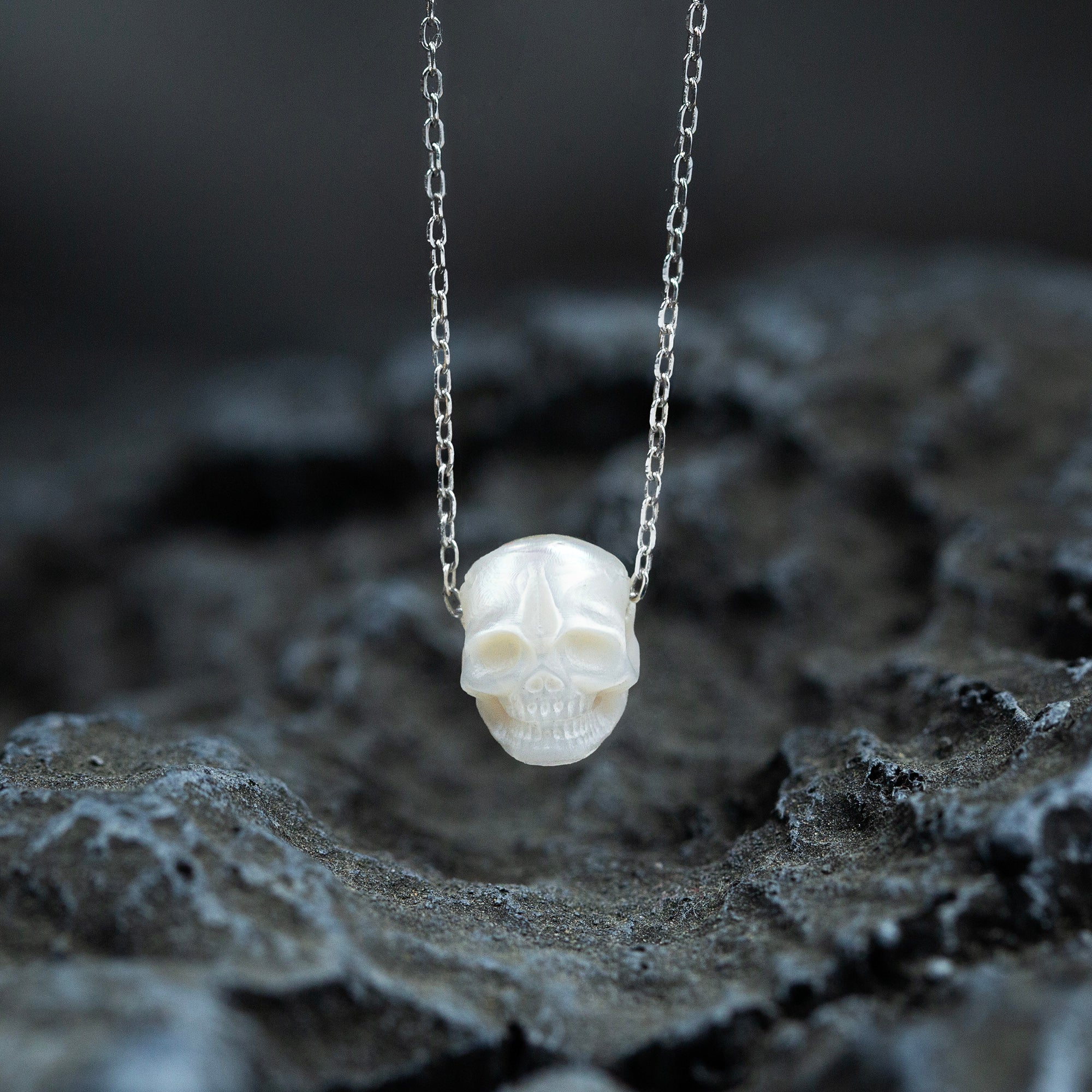 Gothic Minimalist Pearl Cranium Pendant Necklace
