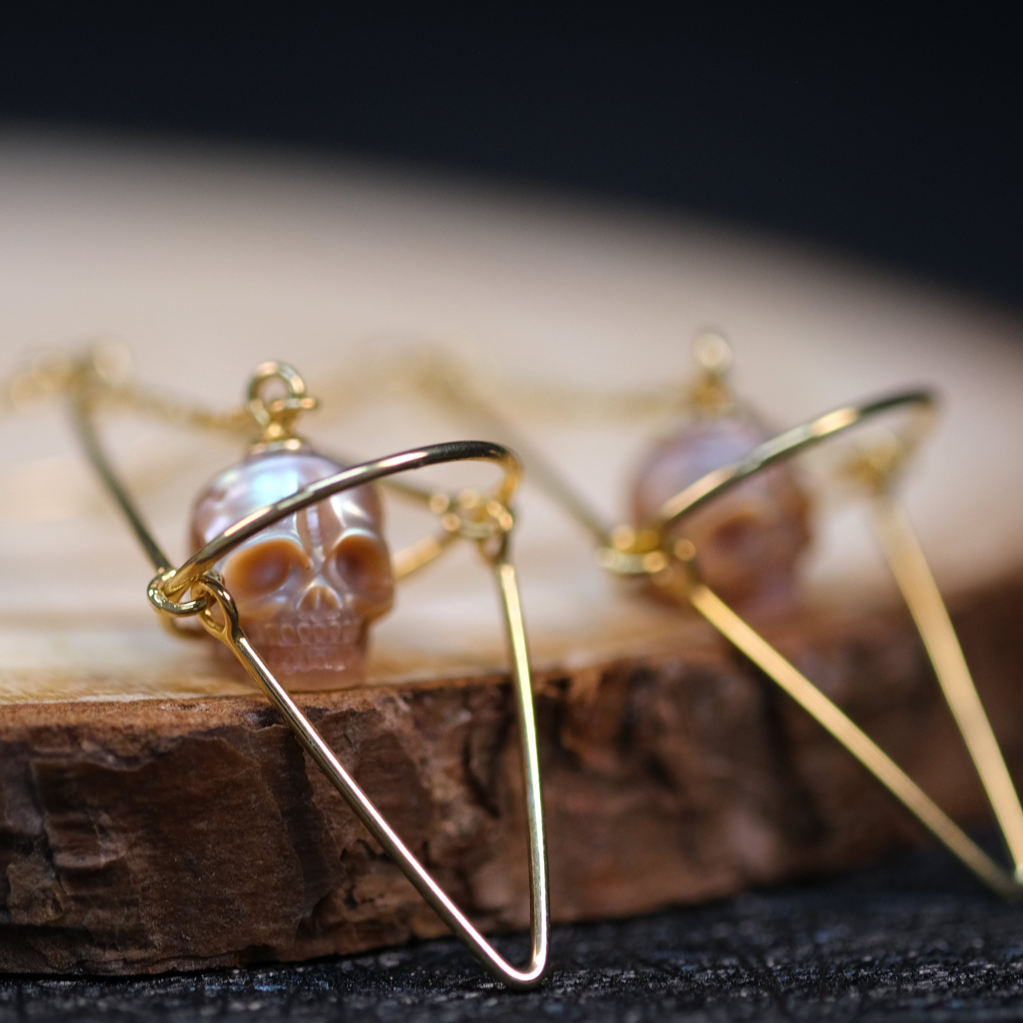 Im geometrischen Käfig schwebt ein leuchtender Perlenschädel, der den Blickfang der Ohrringe bildet. Der Schädel ist mit viel Liebe zum Detail gefertigt und zeichnet sich durch glatte Konturen und naturgetreue Gesichtszüge aus. Die Verwendung einer Perle als Schädel verleiht dem Design einen Hauch von Eleganz und Raffinesse und bildet einen Kontrast zur kantigen Käfigstruktur.