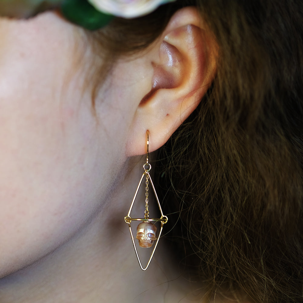 Die geometrischen Perlenschädelkäfig-Ohrhänger sind ein eindrucksvolles Beispiel für zeitgenössisches Schmuckdesign, das geometrische Elemente mit skurrilen Motiven kombiniert.