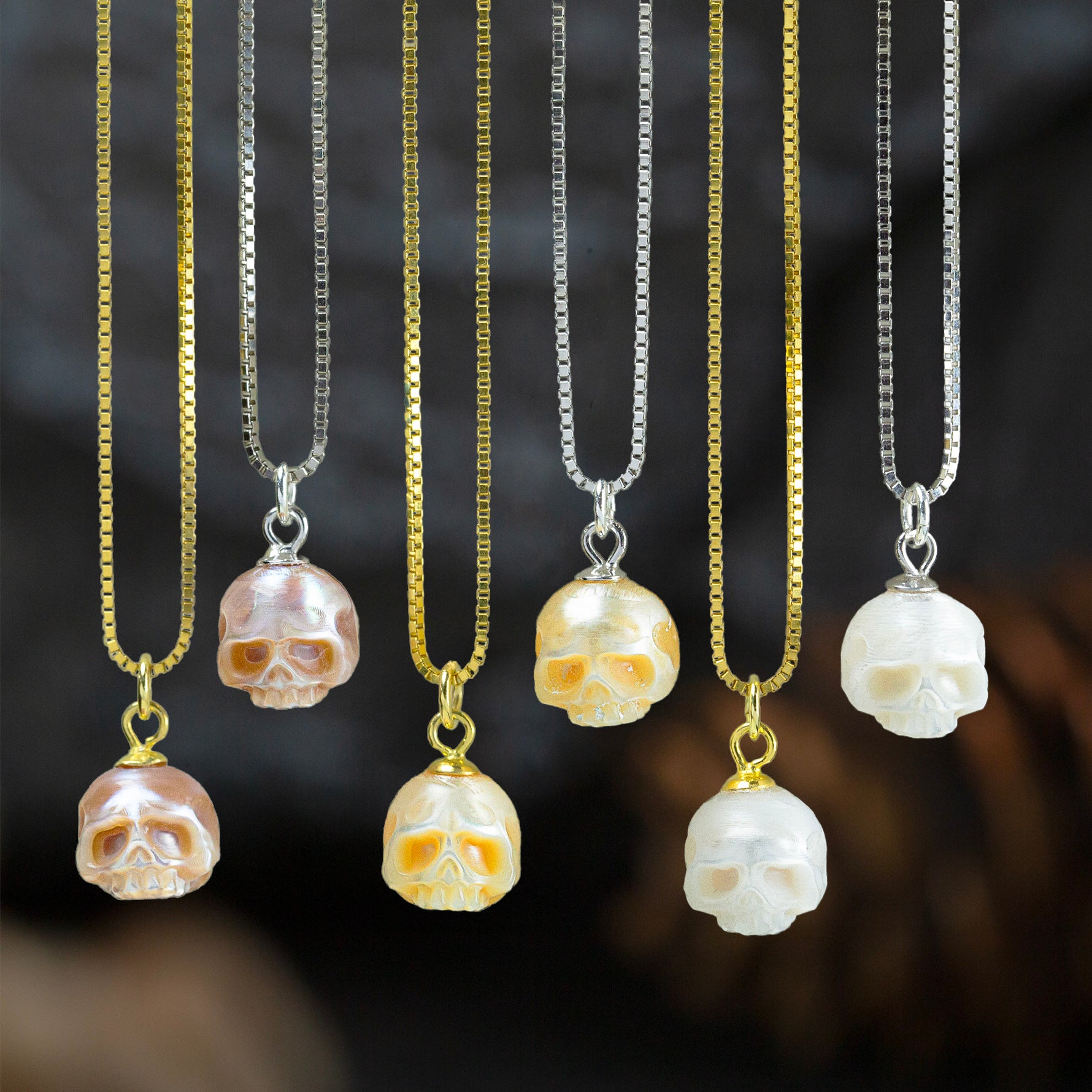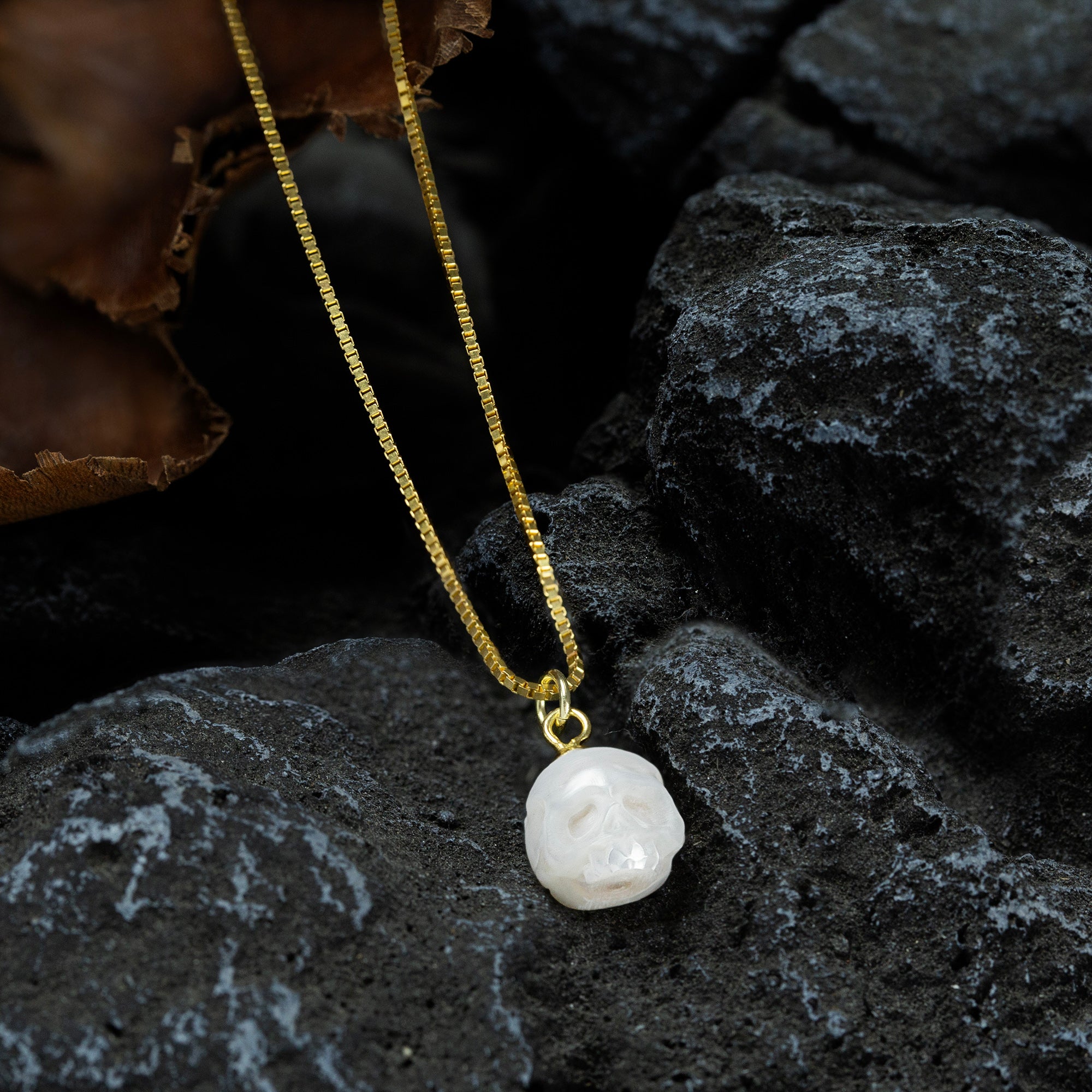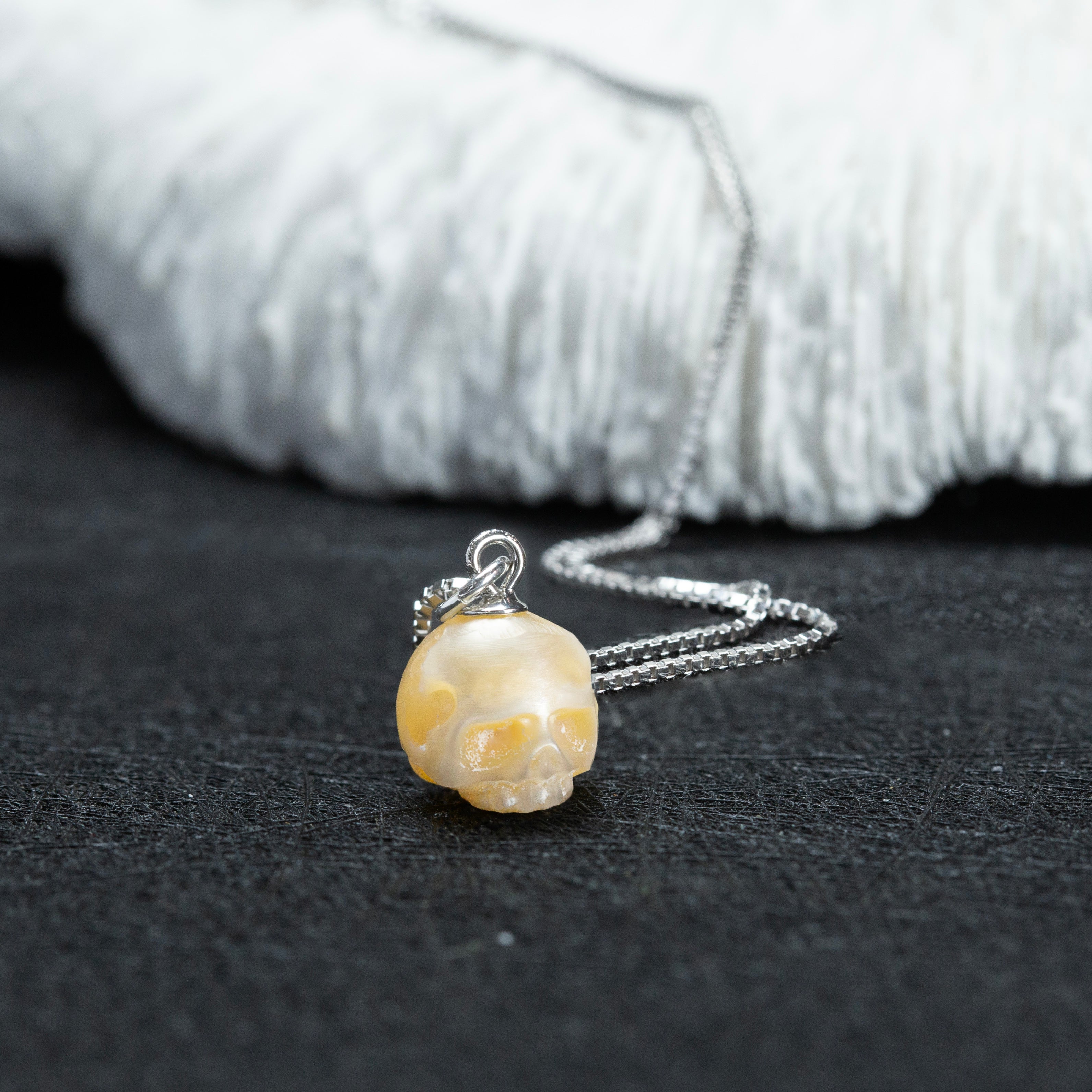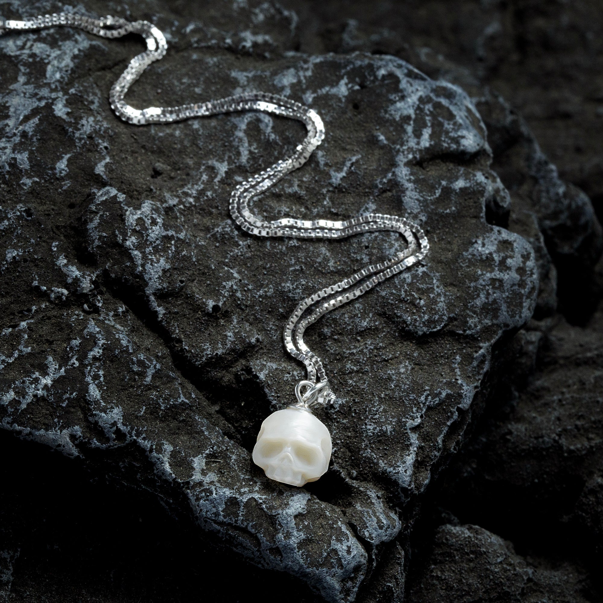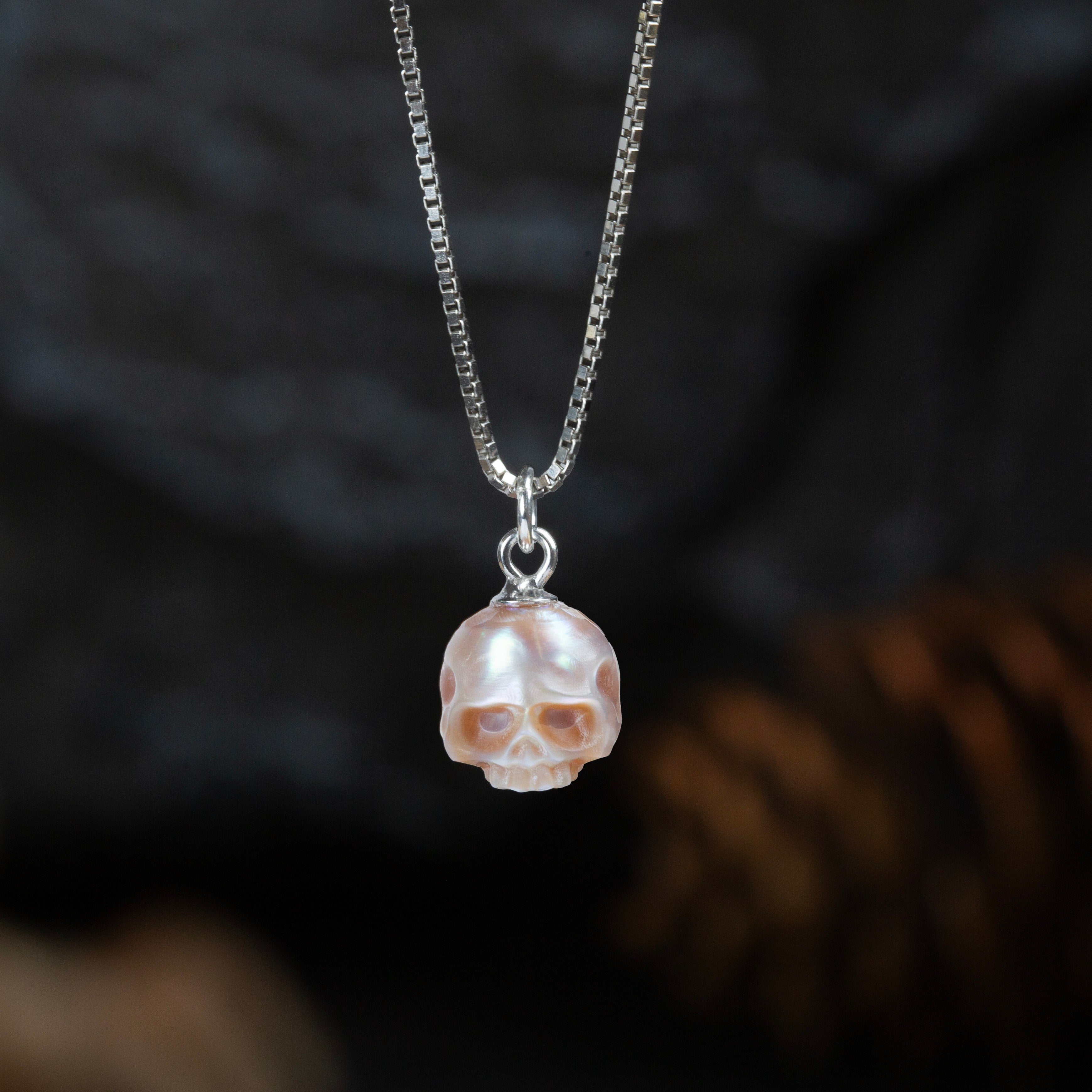Ce collier pendentif élégant et avant-gardien du crâne de perle est fait de perles de haute qualité sculptées à la main. La chaîne unique en forme de boîte ajoute un tempérament unique.