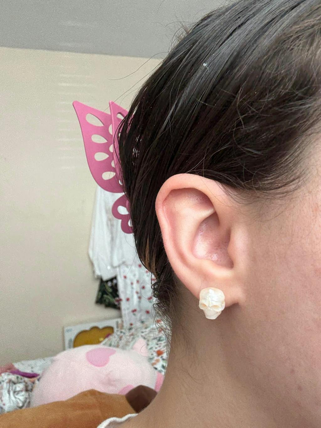 I had to get my jewelry pliers out to open the jump ring and turn the skull around to create a left and right earring since the stones are on one side of the earring. If you put both in, one earring has the stones facing out with the skull forward, the other has the stones facing your neck and the skull backward. Otherwise, I like them a lot.
