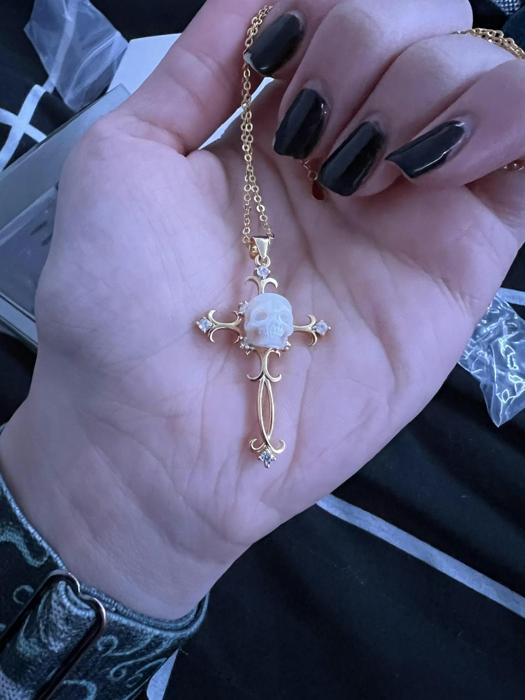Baroque Carved Cross Pearl Skull Gemstone Pendant Necklace