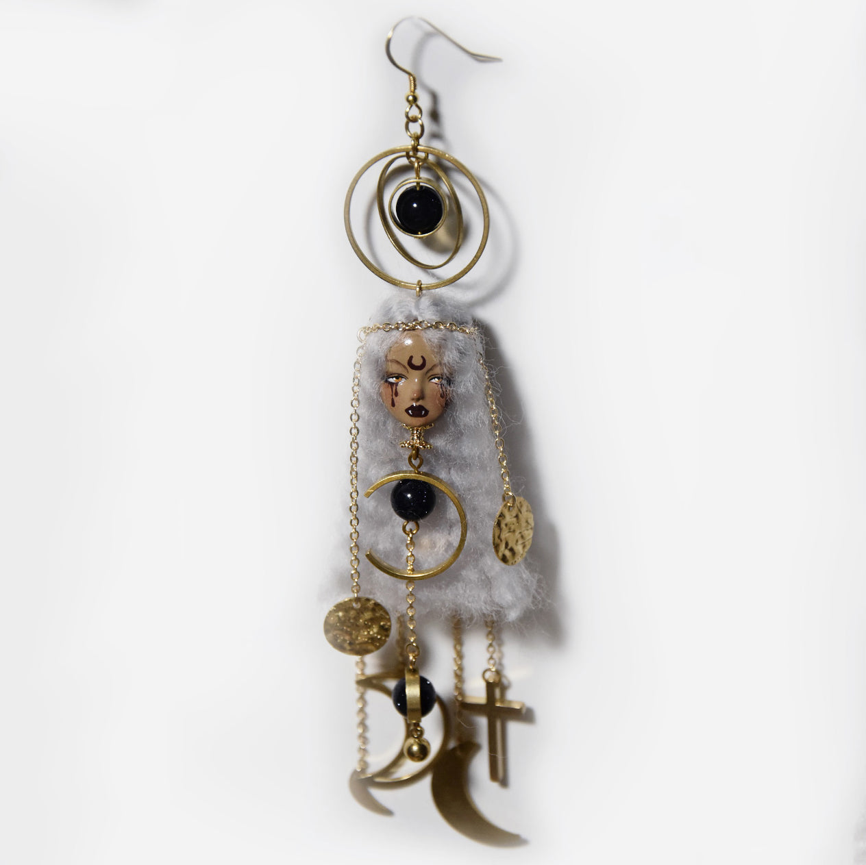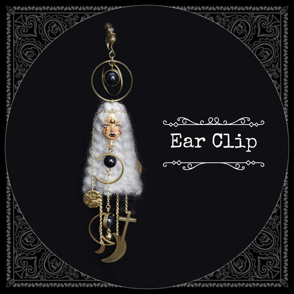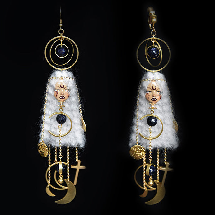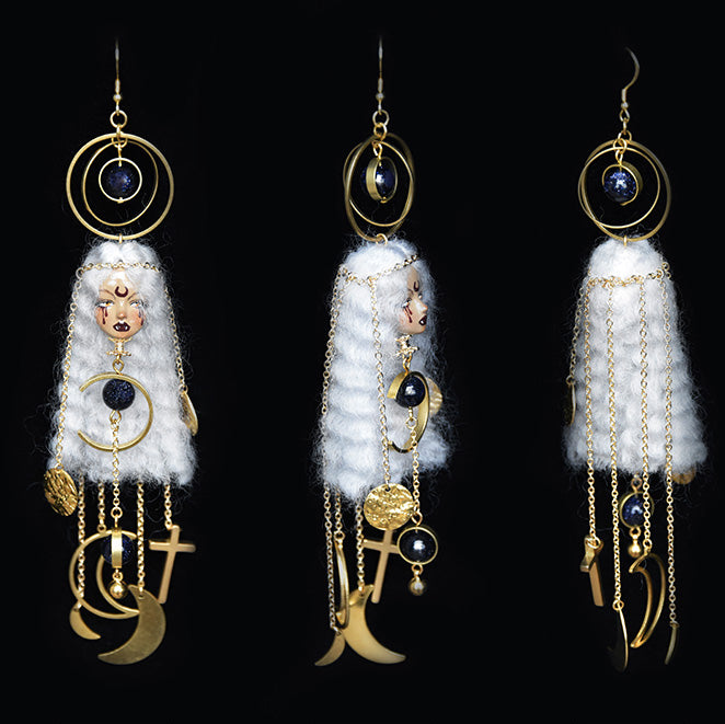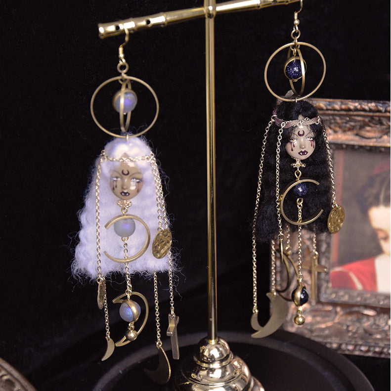 Unleash your inner mystic with these enchanting Moon Witch Doll Earrings—a spellbinding fusion of celestial charm and artisanal craftsmanship. Inspired by lunar magic and folklore, each pair is lovingly hand-sculpted from soft wool felt and polymer clay, adorned with shimmering metallic details, satin ribbons, and a striking crescent moon painted delicately on the doll’s forehead. Versatile ear hooks for pierced ears or secure clip-ons for non-pierced wear—designed for all coven members.The signature crescent moon forehead design and moody color palette evoke midnight magic and celestial energy.